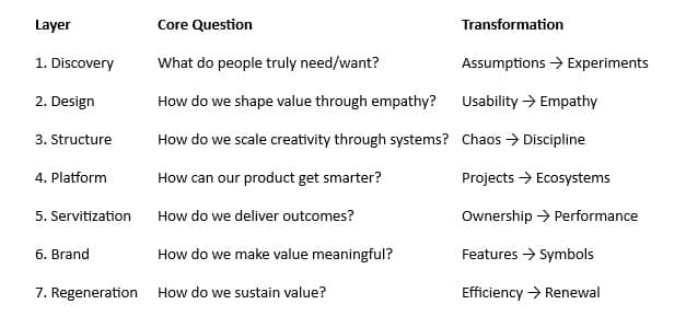 These seven layers map how an idea matures from a spark of insight into a living system of value that sustains itself over time.
